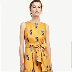 Ann Taylor Yellow Pineapple Print Fit and Flare Midi. Golden yellow midi length fit and flare dress with allover pineapple print. Sleeveless. Crew neck. Attached self tie belt. Full skirt. Pockets. Novelty print. 96% Cotton, 4% Spandex.