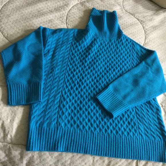 Ann Taylor longer warm turtleneck sweater. Pretty green/blue; they called it azure. Pit to pit 22 inches, front shoulder to hem approx 24 inches (lower hip). Different cables on front than sleeves & back. See pictures. Worn twice only, washed on cold & delicate. Laid flat to dry. No pilling. Very warm! Reduced shipping, offers welcome.