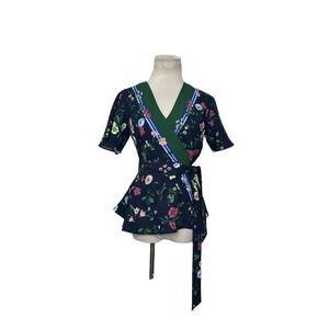 Ann Taylor black pink floral short sleeves wrap blouse size XXSP