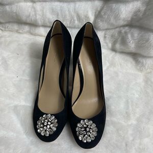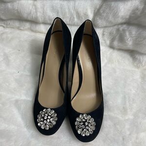 Ann Taylor black suede block heels round toe brooch rhinestones accent SZ7.5M pre owned in good used condition normal wear see all pictures any questions please message