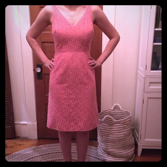 More pics of AT pink lace dress (see prior listing). I'm a size 2, with a 25-26 waist. This pic was taken after eating dinner with no spanx on and it still fit, but if you are any larger than a 26 who recently stuffed her piehole, this probably won't flatter. Additionally, I'm a large c cup. Anything bigger than D won't fit.