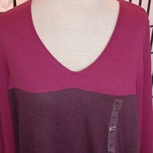 25% wool, 20 % rayon, 25 % polyester, 30 % nylon. V-neck. Colors are kind of red and brown. Side slits. Bust 22", Length 30". New with tag.