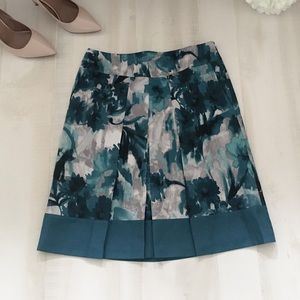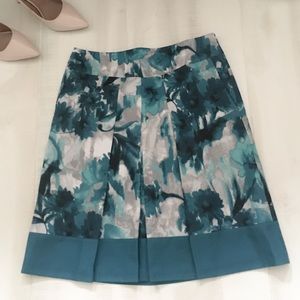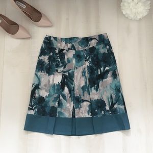 EUC Ann Taylor factory skirt. Water color floral print. Gray base with teal floral print, and teal hem. Front pleats, back has none. Side zip. Functioning side pockets. Size 2. Shell & lining both 100% polyester. Waist 14.5", waist to hem 21.5".