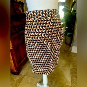And Taylor pencil skirt size 0 excellent condition hidden zipper in the back kick flip at the hem Geometrical design. black brown and cream color nice stretch material