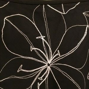 This is simply a beautiful skirt. Black linen skirt with white stitched flowers and a silk lining. Side zip, hook and eye closure. A-line, hits at the knee. Flattering, elegant, feminine, and stylish. It is too big for me now, so it sadly hangs in my closet. Size 0. Non-smoker.