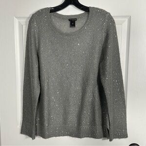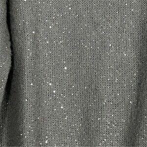 Ann Taylor Factory size XL gray sparkly sweater, with silver glittery highlights. Loose weave, 61% polyester/25% acrylic/11% nylon/3% wool.