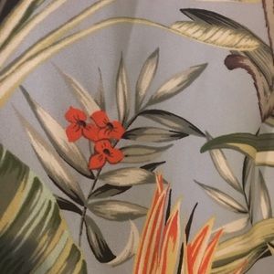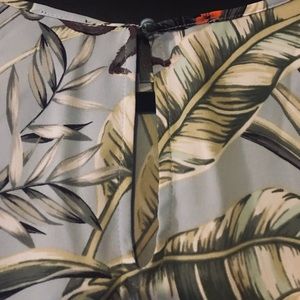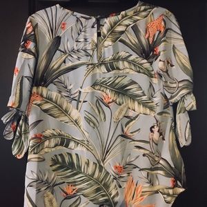 Crepe/georgette fabric with a tropical print. Rounded hem. Round neck. Short sleeves with tie details. Back keyhole with button closure. Never worn with tags perfect condition. Sold out immediately in stores. Size XS. Fabric 100% polyester. Machine wash cold.