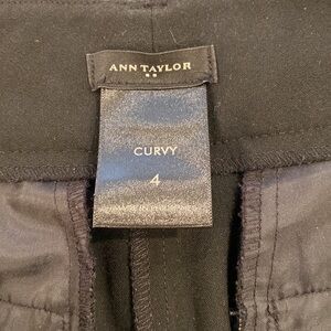 Ann Taylor trousers. Straight leg with a very very slight flare waistband has belt loops. Black. Pockets are slit pockets in front and side seam Front closure is zipper and hooks with a slight offset. Just makes them a little more dressy with that detail. Curvy fit which gives a little extra comfort in the hips