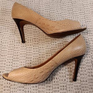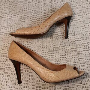 Ann Taylor women's beige leather croc embossed peep toe high heel shoes sz 9.5 Medium. Pre-owned.