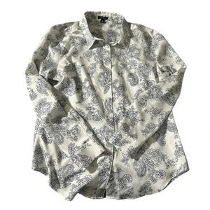 Ann Taylor women's small long sleeve button down sheer blouse paisley print, white and blue, tab sleeves, pit to pit 20", length 27" modest, great condition, smoke and pet free home