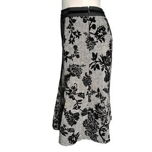 Paneled A line skirt with hidden side zip. Grey tweed with black velvet floral design. Black twill waistband with black ribbon. Fully lined. Area of stain at hemline, see picture.
