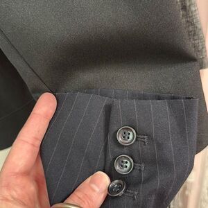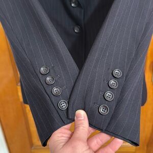 Great condition DARK navy blue striped two button blazer. Photo 5 shows how dark it is compared to a true black color. Women’s size 2 faux pockets, very light shoulder padding. Fabric label missing. Measurements taken flat are approximately: