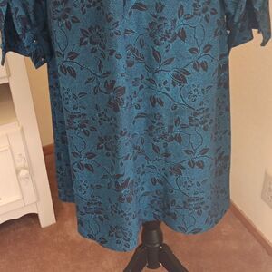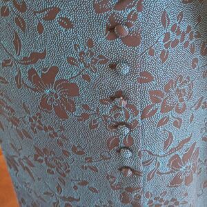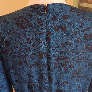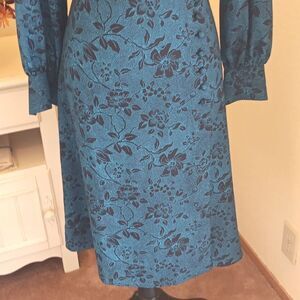 Retro inspired from a beautiful era. Wrap bodice, waist seam. Buttons down the left front of the wrap skirt. Long sleeves with covered buttons at cuffs. Fully lined. Back zip. Size 0, showing on my size 4-5 mannequin, measures 35 at chest, 28 at waist, 38 at hips. 41 long from shoulder to hem. One the prettiest dresses in my closet.