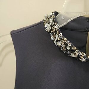 Charcoal Grey Sleeveless Sheath Dress with Beaded Mock Collar, Fully lined, zip back.