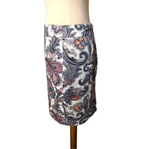 Ann Taylor Paisley on white petite fully lined mini skirt size 6P. Hidden back zipper and hook closure. Vented at back hem for ease to walk.