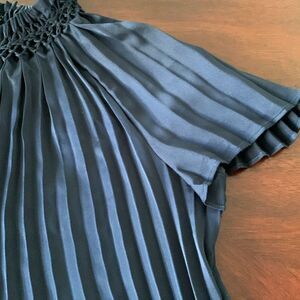 Luxury Navy Blouse, Elegant Accordion Pleat, Designer Silky Top, Holiday Ready Blouse, Versatile Short Sleeve, Faux Pearl Accents, Chic Party Blouse, Stylish Smocked Design, Timeless Wardrobe Staple, Comfortable Loose Fit, #navytop #partytop