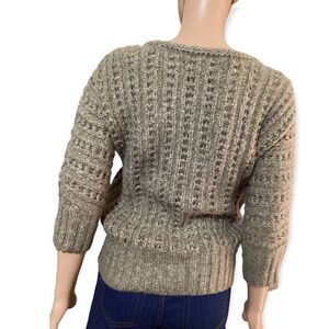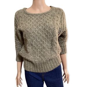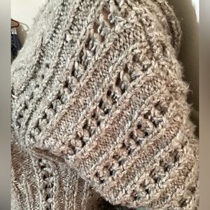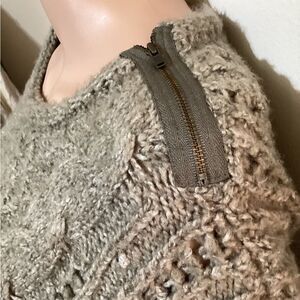 Good used condition, zips open at shoulder, cable knit, soft fuzzy pile, tannish gray color, size XS, open weave back and sleeves, see pics for measurements for custom fit.