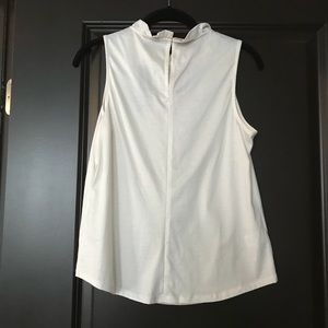 Sleeveless off white shell with ruffle neck detail. Key hole at back neck with hook and eye closure. Never worn. 100% cotton