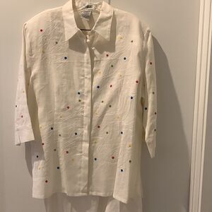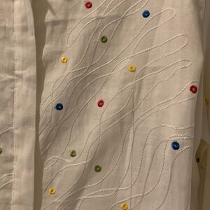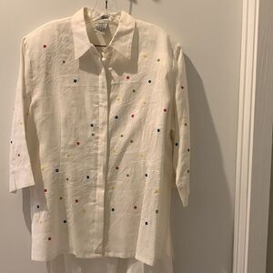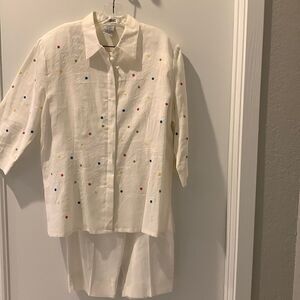 Beautiful Ann Gerlin ensemble is 100% linen. It’s perfect for any occasion and could be dressed up or down. It is vanilla white with stitched see through holes all over the front. Swirl stitched design. Side slits. Button down with hidden buttons. 3/4 sleeve with slit. Capris pants. Pants have front zipper, button closure and elastic side panels. Top: Underarm flat across is 23”. Length is 28”. Pants: waist flat across is 16”. Inseam is 21”. Please note measurements to ensure the proper fit.
