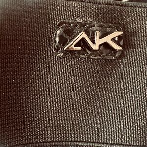 Step out in style with these chic, double strap wedge sandals by Ann Klein Sport. Featuring a sleek black patten, snake skin embossed design with pewter logo on upper strap. 2” wedge heel.