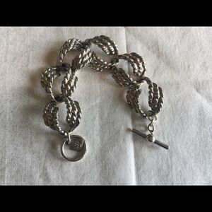 Very Gently Used as show in photos. Anne Klein (see photos of tag) silvertone link bracelet is a nice piece. Measures 7” in length with toggle clasp, each link is 1” in width and 1” in length o give you a better idea.