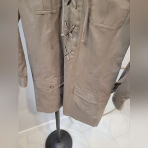 This Ann Mashburn short dress combines utilitarian design with feminine flair. Crafted in a versatile green hue, it features cargo-style pockets that add both functionality and a touch of rugged charm. The dress is tailored to flatter, making it suitable for various occasions, from casual outings to more polished events.