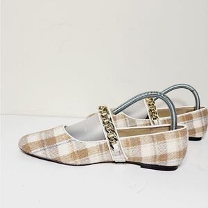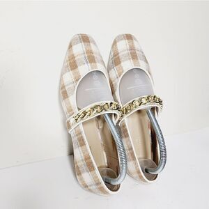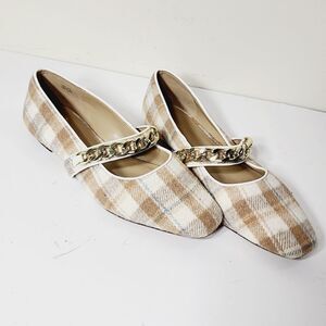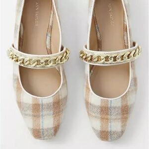 worn like 3x still looks new, has little to no flaws.We've Taken Classic Mary Jane Flats A Step Further, With Shiny Chain Accents And A Warm Neutral Plaid. Rounded Pointy Toe. Padded Footbed For Complete Comfort. 1/4" Heel. Ann Taylor Plaid Chain Mary Jane Flats