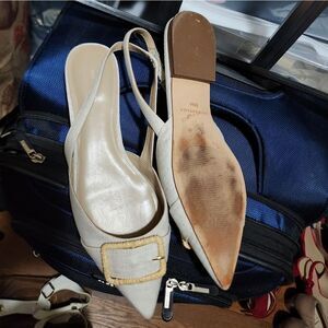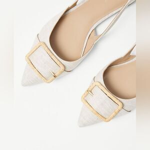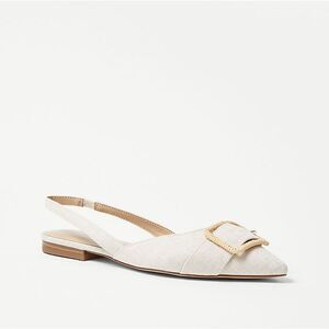 A summery straw buckle adds natural texture to our refined linen flats. Pointy toe. Padded footbed for complete comfort. 1/2" heel.