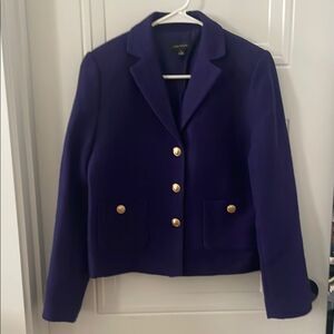 This sophisticated blazer from Ann Taylor combines a rich purple hue with elegant gold button accents, fully lined interior, with front patch pockets making it a standout piece in any wardrobe. Perfect work, its tailored fit and premium fabric ensure a polished look. Ideal for adding a touch of luxury to your professional attire.