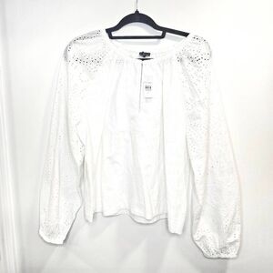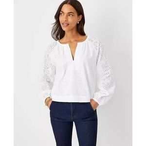 Ann Taylor Eyelet Top Women's Large White Long Raglan Sleeve Popover Blouse