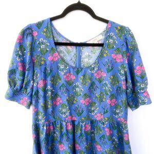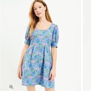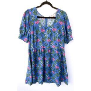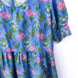 Ann Taylor LOFT Blue Floral U Neck Linen Blend Puff Sleeve Dress12