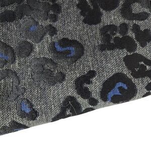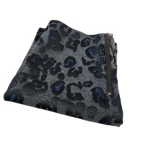 An Ann Taylor skirt made from modernist style blue / black floral on charcoal gray brocade fabric. Side zipper. The luxurious fabric is a 67% polyester, 14% acrylic, 10% silk, 7% wool, and 2% other fiber blend.