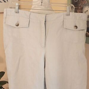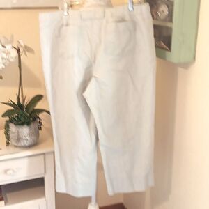 Elegant light celery pants with a classic design. Linen/cotton blend. Tab pockets in front, patch pockets in back. Size 16 measures 38 at waist, 46 at hips. 11-inch rise , 22-inch inseam. Cool and comfortable.