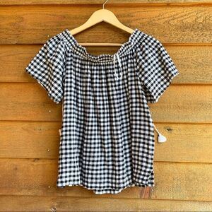 Ann Taylor Loft Black & White Gingham Plaid Ruched Off Shoulder Tassel Tie Top