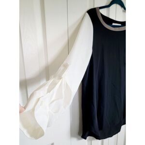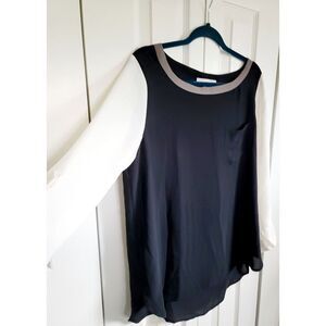 Ann Taylor Loft L Colorblock Pullover Roll Tab Sleeve Blouse Tan Black Eggshell