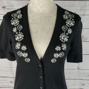 Ann Taylor loft small black with white flower button up cardigan sweater 100% cotton