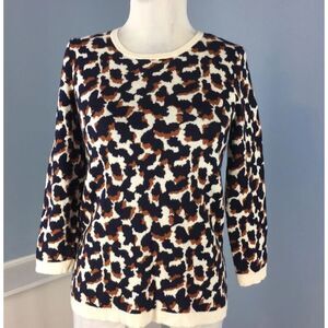 Ann Taylor Animal Print Sweater. Size Small. 3/4 L sleeve, scoopneck. Cream hems and wrists. Dark navy blue and brown print in cream. Perfect layering piece. Office, casual,comfy. 30% wool. Supersoft. Flat lay 25” L 17” P-P.