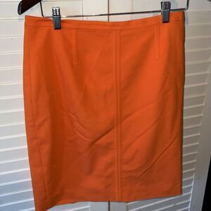 Ann Taylor size 8 solid orange skirt, perfect pop of color for fall, new without tags, has a nice thick stitching fabric detail down the front and along each side, this is replicated in the back, hidden zipper in the back with a slit at the bottom, skirt is fully lined made of a cotton polyester spandex mix, measures 15 inches across the waist with a total length of 22.5 inches