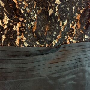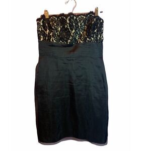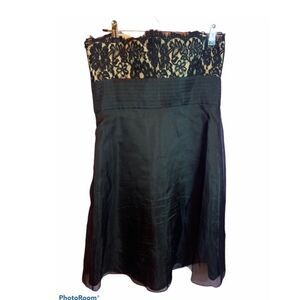 Ann Taylor Strapless Black Lace Dress, bodice has lace over nude underlayer, pleated mid section and flared layered skirt, stunning black dress for that special event