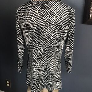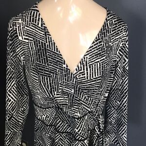 Ann Taylor black and white bamboo weave print top. 3/4 sleeves. Faux wrap front creates V neckline. Set in belt that ties to left side is trimmed in black cording. Stretchy polyester/spandex blend. Size small. New, no tags. Nonsmoking home.