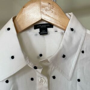 Ann Taylor petite white long sleeve black Polka dot button down shirt size 2P