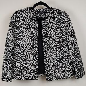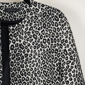 Ann Taylor Collarless Animal Print Jacket Blazer in Black, Tan and Cream. 2 pockets in the front. Hidden hook and eye front closure. Long sleeves. Fully lined. Gorgeous jacket ready for any occasion! 70% cotton and 30% polyester in a size Small.