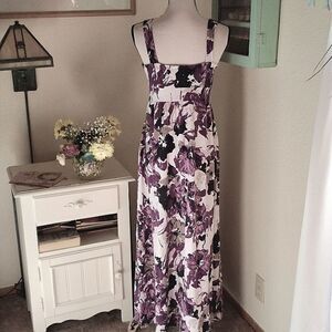 Cotton cool and super cute. Wrat at top, bra friendly straps.Band under chest.Pull over style. Size S/6 measures 36 at chest, 28 under chest, 44 at hips, 53 long from shoulder to hem. Lovely purple blossoms with black and taupe details on off white.