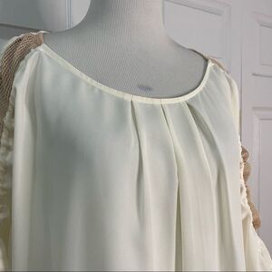 cream color blouse with tan crochet knit fabric stripe alongside sleeves. rounded hemline.