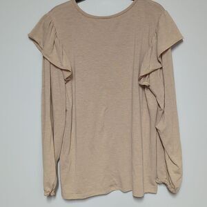 Camel, long sleeve blouse. Cute detail on the shoulders.