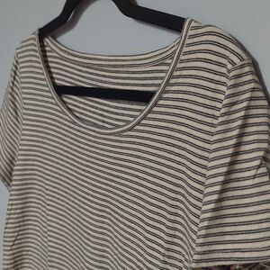 Tan with black stripes, scoop neck, short sleeve shirt.