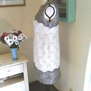 This dress is a perfect combination of woven fabric and lace. The taupe and cream colors are lovely together. Dress bodice has princess seams, and is trimmed on the top and bottom with lace. Back zip. Fully lined. Showing on my size 4 mannequin, and is roomy on it. Size 4p measures 36 at chest, 34 at waist, 40 at hips, 35 long from shoulder to hem. Perfect for now. Beautiful fabric.
