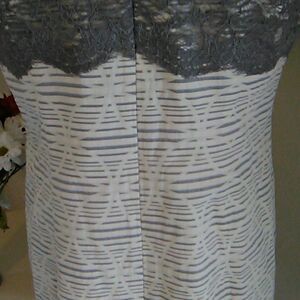 This dress is a perfect combination of woven fabric and lace. The taupe and cream colors are lovely together. Dress bodice has princess seams, and is trimmed on the top and bottom with lace. Back zip. Fully lined. Showing on my size 4 mannequin, and is roomy on it. Size 4p measures 36 at chest, 34 at waist, 40 at hips, 35 long from shoulder to hem. Perfect for now. Beautiful fabric.