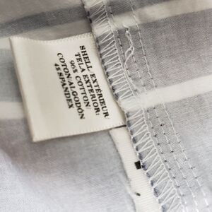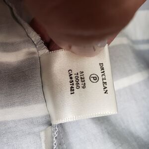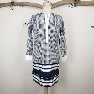 Crisp classic shirt dress. Blue and white graphic in circular pattern and striped bottom. Contrasting cuff and collar. Popover tunic style.