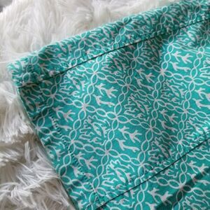 Size 4 turquoise skirt with a white print. Button closure career casual